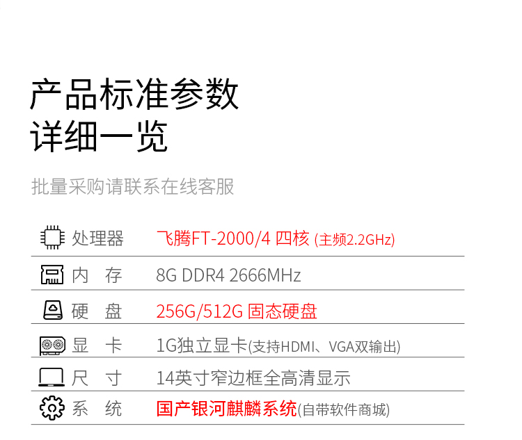 长城(Great Wall)QF722 国产信创 FT-2000/4核/2.2GHz/指纹解锁/8GB/256GB M2.SSD/2G独显/13.3英寸高清)